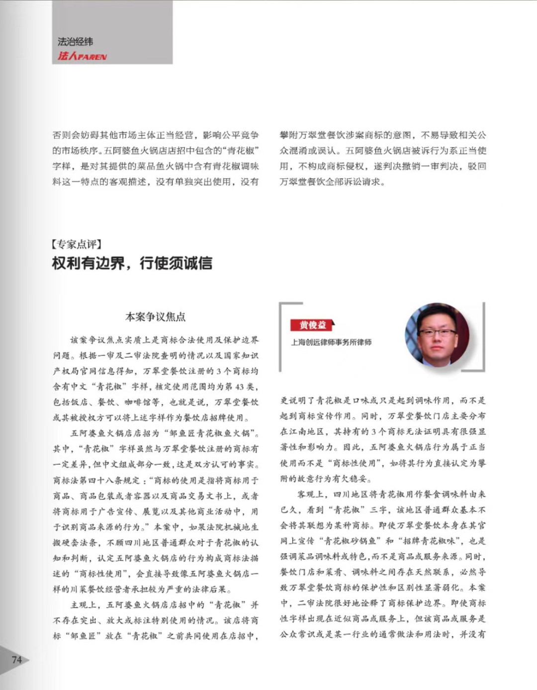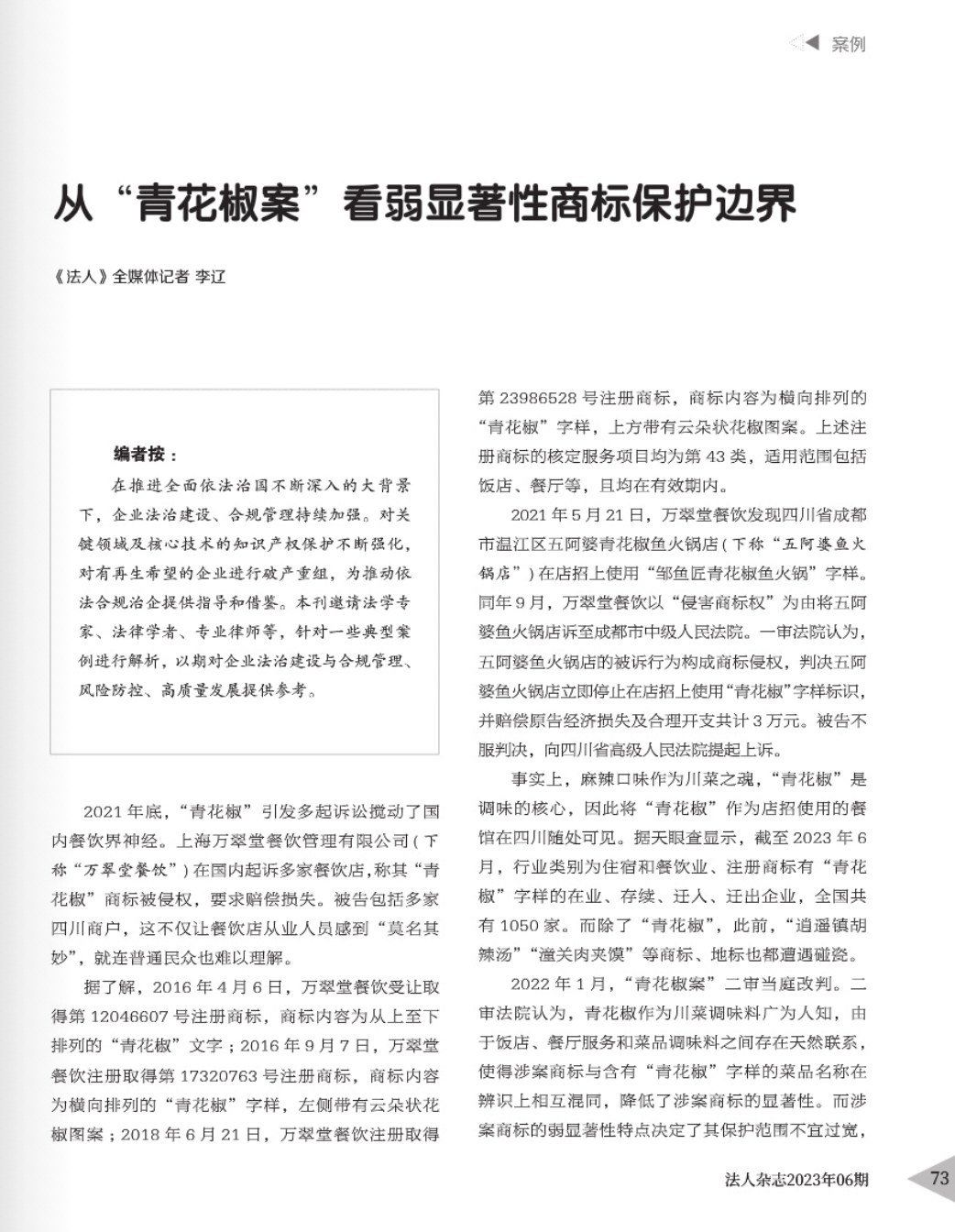涉“青花椒”商标侵权案一直以来备受关注,2022年1月份,四川高院在“青花椒”案的二审中,当庭改判,驳回上海万翠堂餐饮管理有限公司的全部诉讼请求。2个月后的十三届全国人大五次会议最高人民法院的工作报告亦盖棺定论,不青花椒等“碰瓷式维权”不受保护。